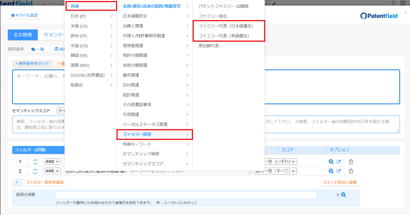 フィルター項目「共通」→「ファミリー関連」→「ファミリー代表(日本優先)」/「ファミリー代表(英語優先)」を選択します。