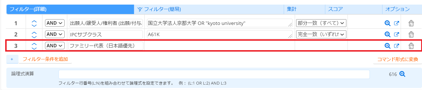 「ファミリー代表」で絞り込んだ母集合に対して、さらに絞り込みを行う場合は、上図の4行目以降に検索条件を入力します。