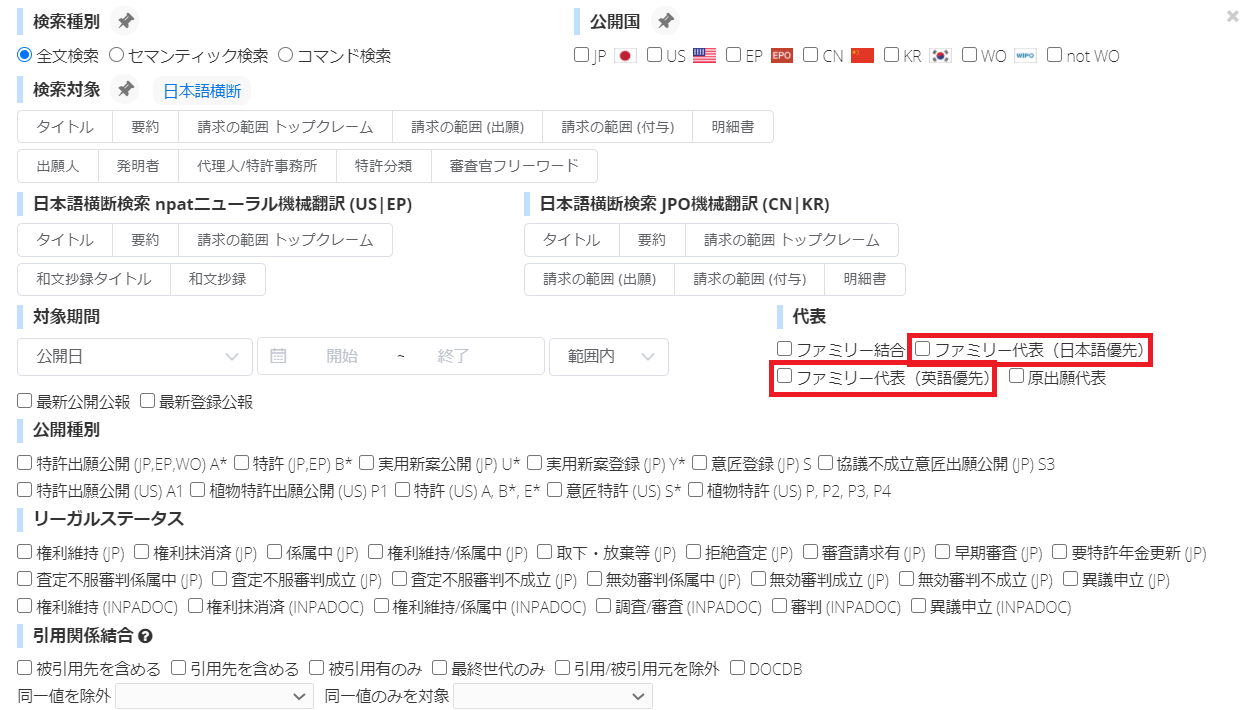複数のファミリー出願がある場合に、優先適用順位に従って複数のファミリー出願から代表のみを検索することができます。