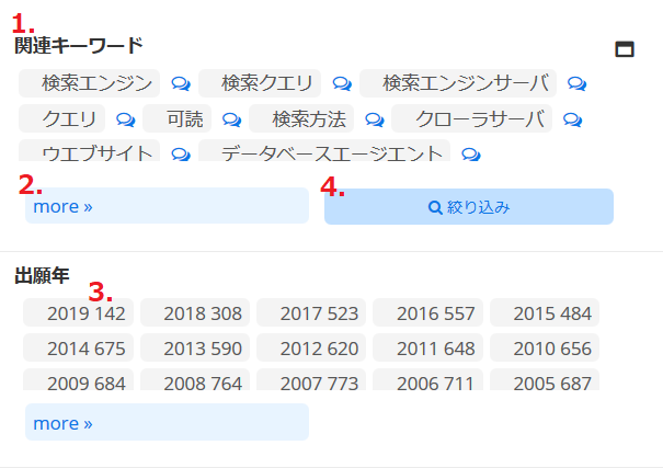特許・実用新案の検索・分析結果ページは、グラフエリア1と、ファセットナビゲーション2と、操作メニューエリア3と一覧エリア4から構成されています。