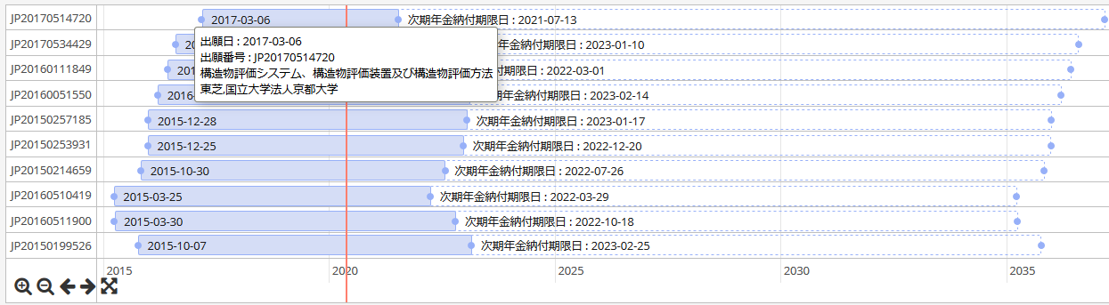 検索結果の出願日、年金納付期限日、存続期間満了日などのイベントのタイムラインを表示します。