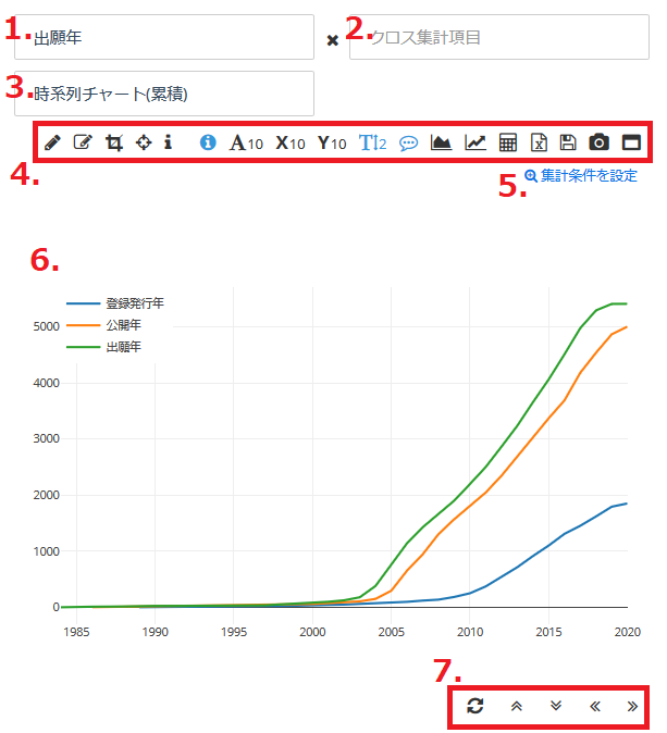 検索結果に対応する出願人などの集計結果に基づくグラフが表示されるエリアです。