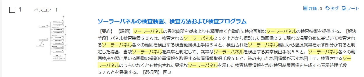 ほどスコアが高くなります。ただし、タイトル > 要約 > 請求の範囲 > 明細書の順で係数がかけられており、