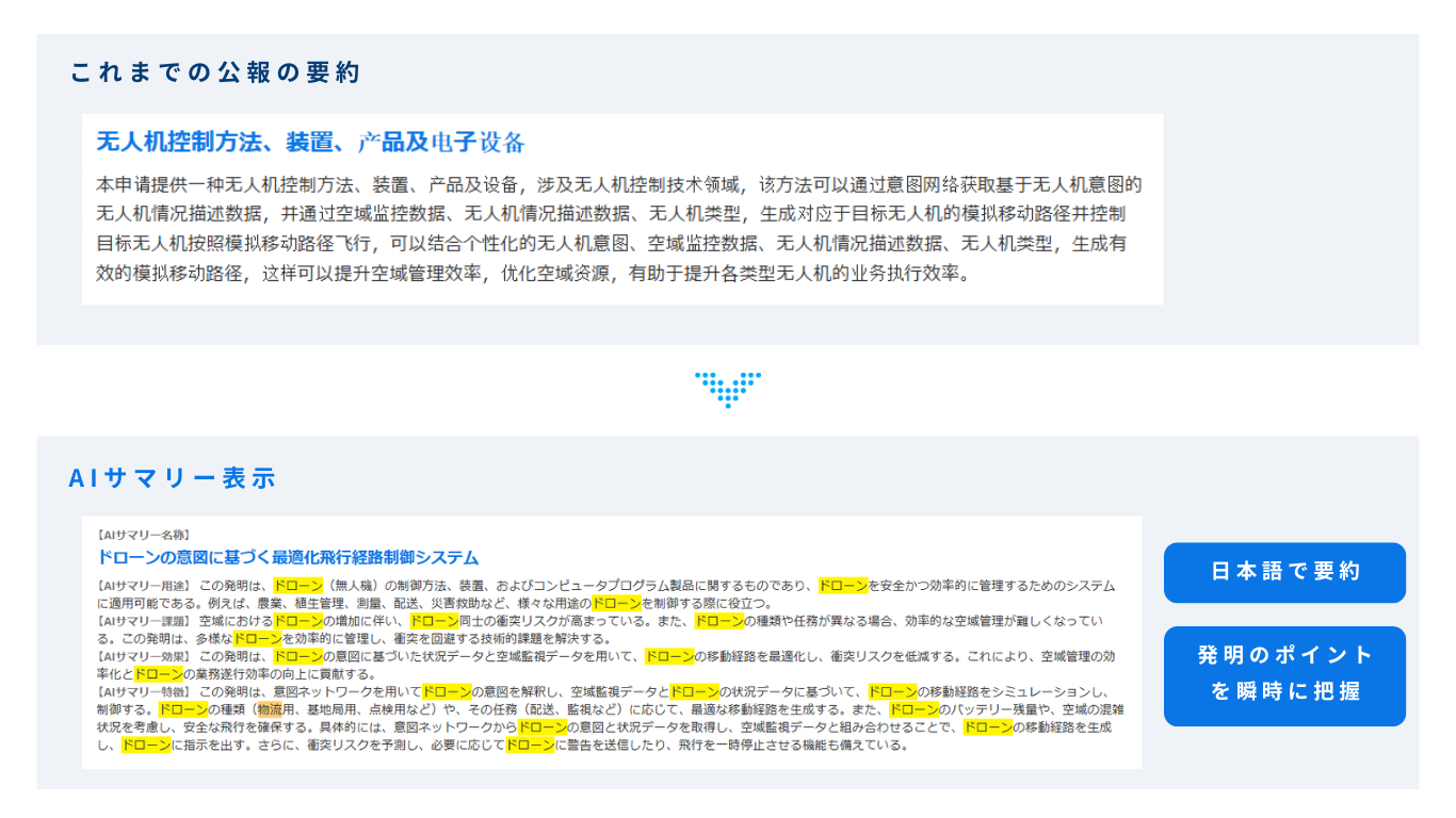 日本語の独自翻訳のテキストを検索対象とすることで、日本語で海外特許のテキスト検索・AI検索が可能になり、グローバルでの関連特許検索を強力にサポートします。