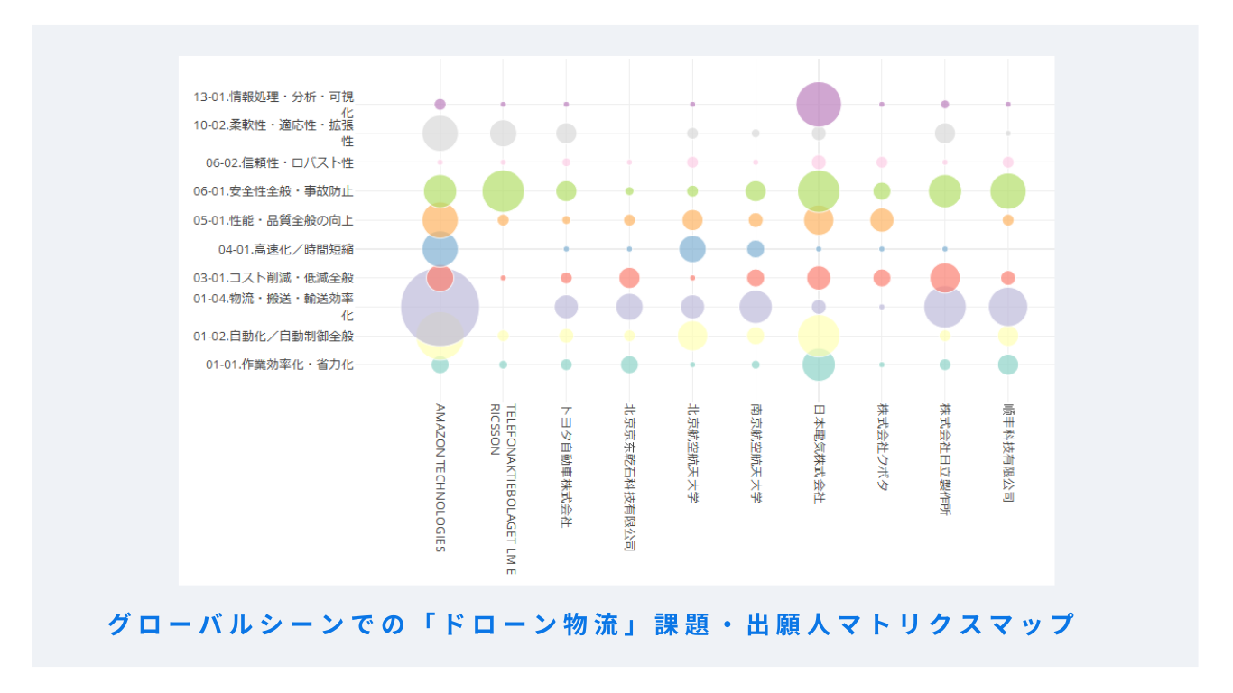 海外特許に付与された日本語の分類ラベル(用途・課題ラベル)を使用して、グローバルで横断した用途・課題マッピングが可能になります。